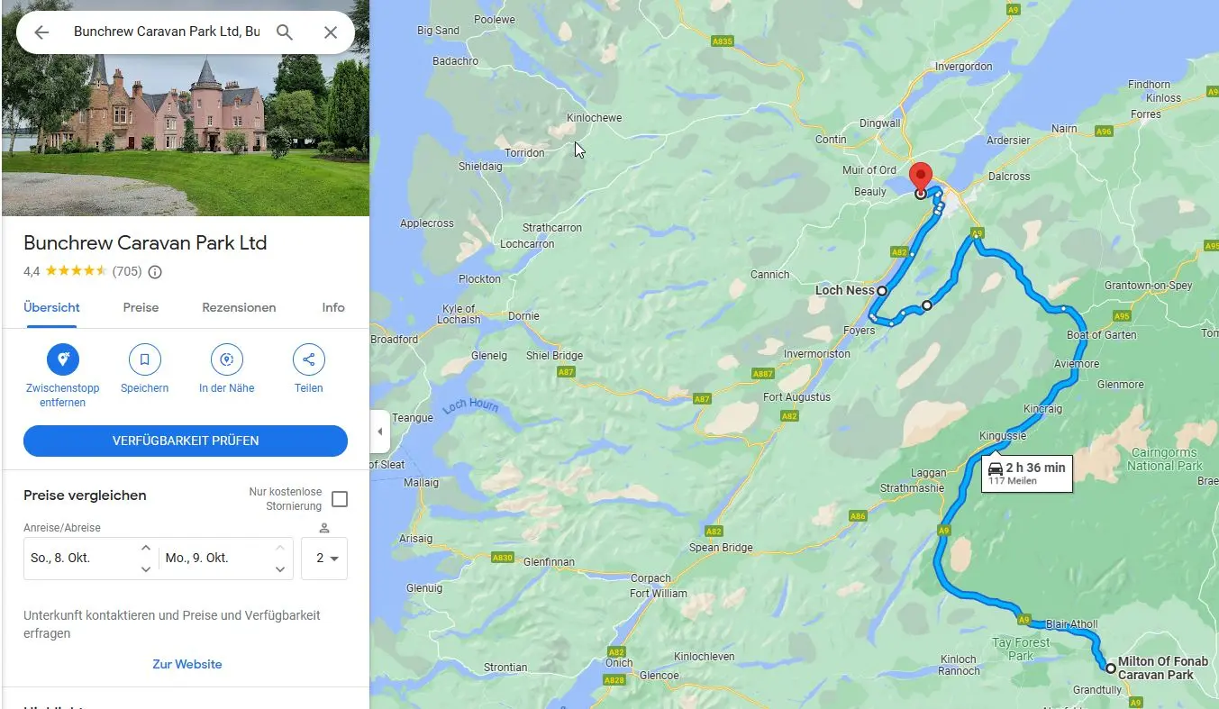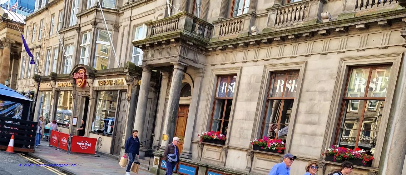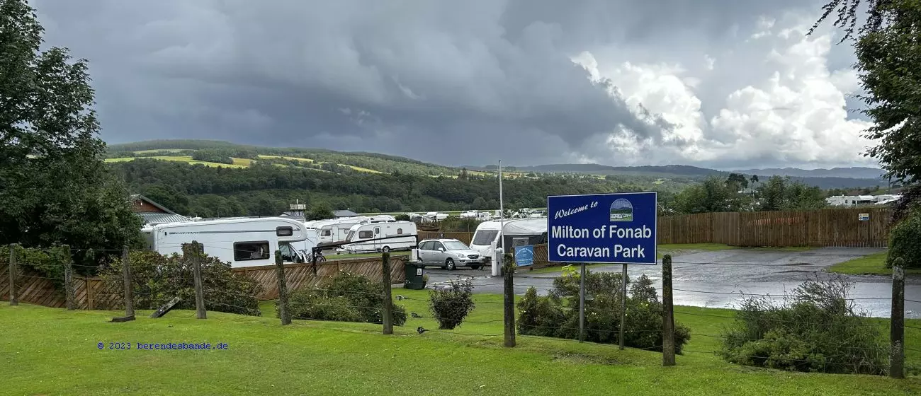 Am Samstag hat es aufgehört zu regnen. Nach dem Morgenritual - Gassirunde - Frühstück - Emma von Hundehaaren befreien, geht es nach Edinburgh. Wir sind nicht wirklich die großen Städtetourer und Kulturbanausen sind wir allemal. Wir navigieren zum Hard Rock Cafe. Wir finden es und können ein (schlechtes) Foto schießen. Was wir nicht finden, ist ein Parkplatz für unser Schiff. Da es zum Essen sowieso zu früh ist, fahren wir weiter. Die Tour geht über Perth Richtung Inverness. Wir kommen in ein Gewitter mit Platzregen. Wir suchen und finden einen Stellplatz in Pitlochry bei Milton of Fonab Caravan Park. Der Platz ist gut gepflegt mit großen, ebenen Parzellen. Das Sanitär lässt von außen Schlimmes vermuten. Von innen findet man jedoch ein modernes, sehr gut ausgestattetes und sauberes Sanitär. Das ganze Paket kostet uns 36 Pfund. Die Gassirunden müssen nach dem Regenradar gelegt werden. Immer wieder gewittert es mit heftigen Schauer. Unsere Nachbarparzelle stand teilweise komplett unter Wasser. Gegen Abend beruhigt sich das Wetter. In Pitlochry gibt es die kleinste Destillerie Schottlands. Der werden wir morgen einen Besuch abstatten.