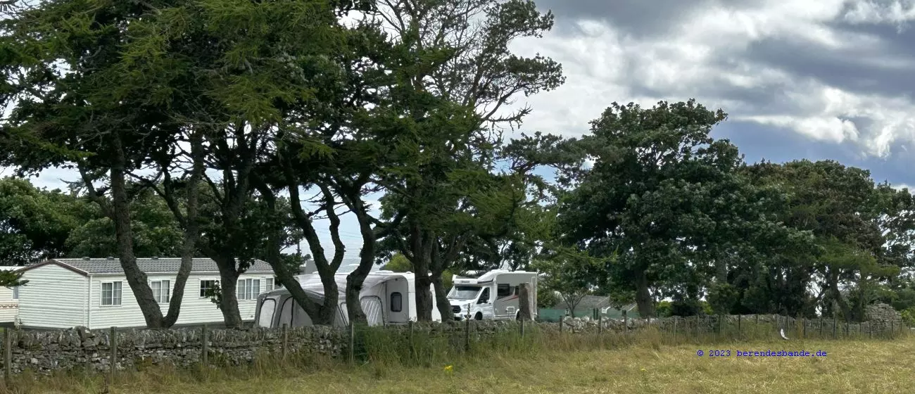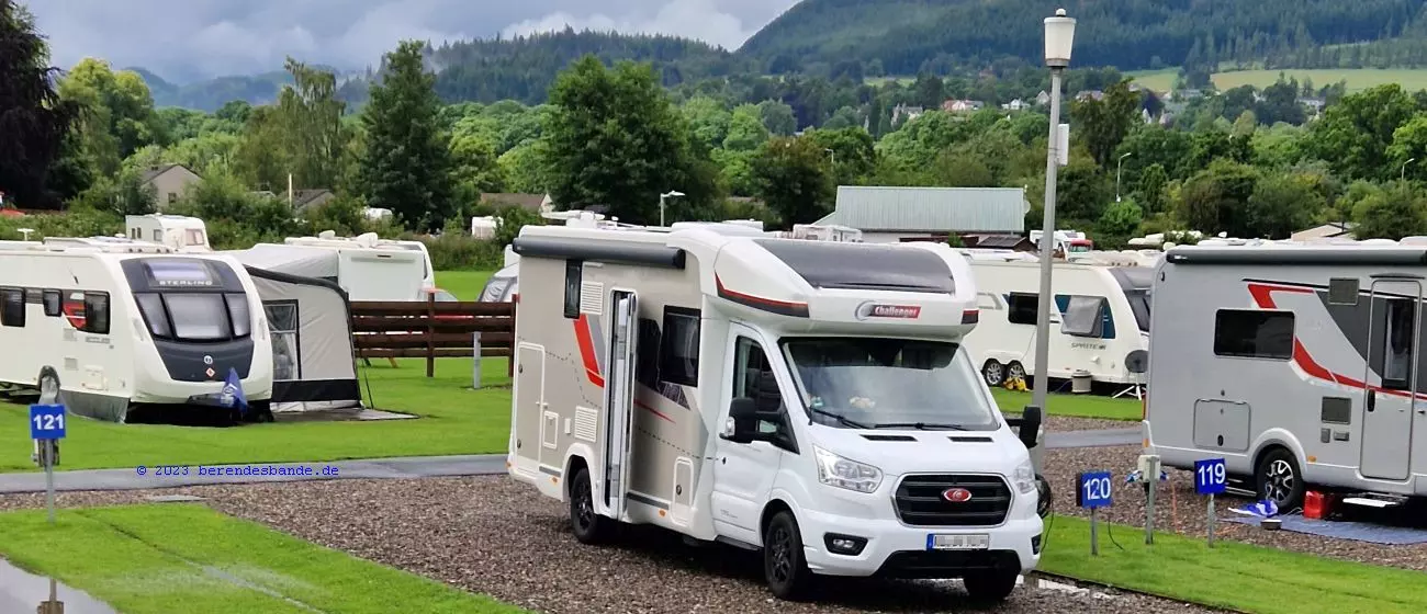 Es kommt alles ganz anders. Es ist 7:30 h und wir liegen noch im Bett, als Snickers plötzlich zu schreien beginnt. Er liegt vor dem Beifahrersitz und ist mit seinem Hinterteil in die Trittstufe gerutscht. Seine linke Vorderpfote hat sich dabei im Beifahrersitz verhakt. Nachdem wir ihn befreit haben, klafft eine große blutende Schnittwunde an seiner linken Pfote. Wir bringen ihn sofort in eine Tierklink, wo eine OP notwendig wird, um die Wunde zu verschließen. Am Nachmittag holen wir ihn ab, er ist noch ganz benommen von der Narkose. Wir fahren nur eine kurze Tour und bleiben über Nacht bei Lauder Camping and Caravaning Club. Es ist ein schöner gepflegter Platz und wir werden, dank der Camping Key Card als Mitglieder berechnet. Für 39 Pfund gibt es einen schönen Stellplatz, ein sauberes Sanitär und Ruhe, die wir gut gebrauchen können. Es gibt auch einen Dog-Walk auf dem Platz, der aber nur für verletzte Aussies ausreichend ist.