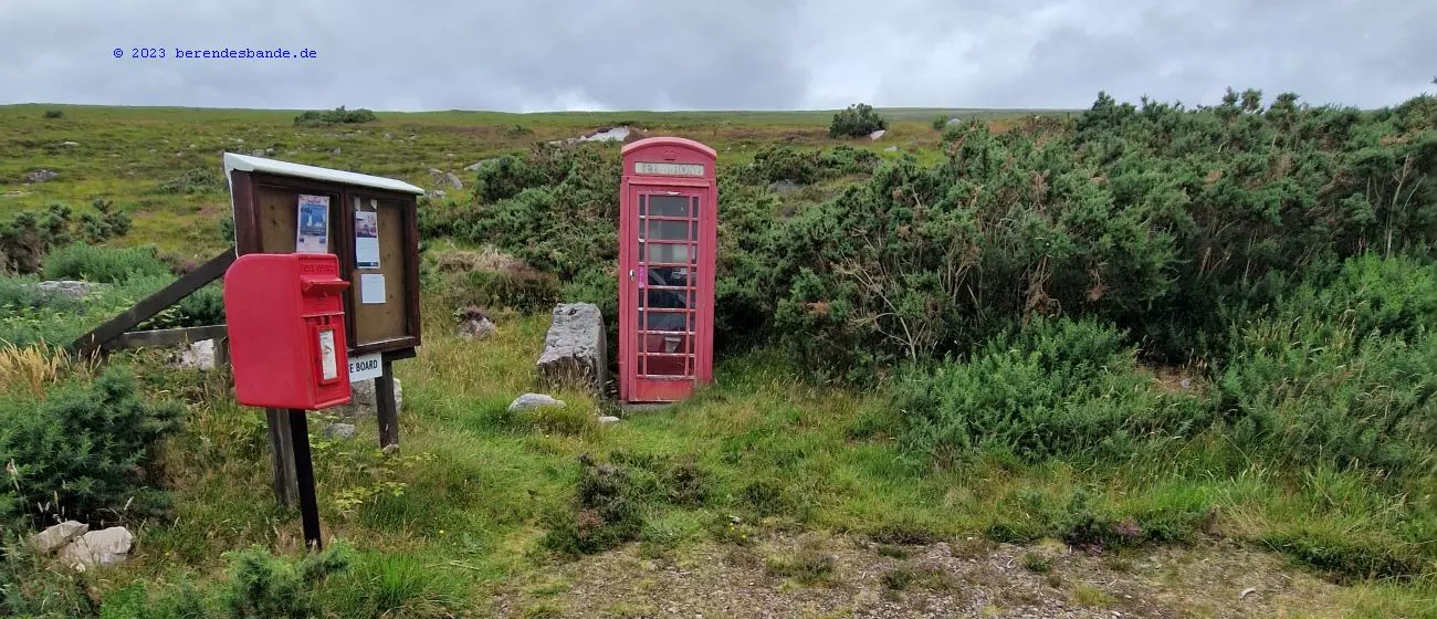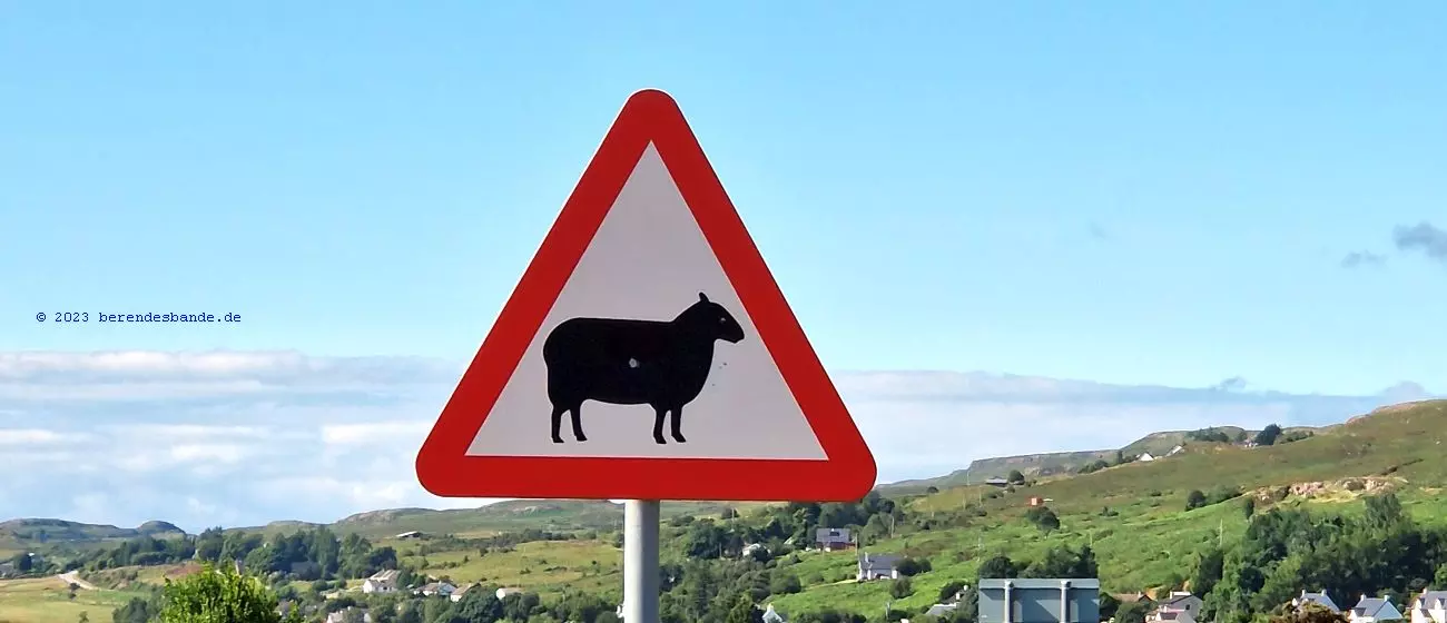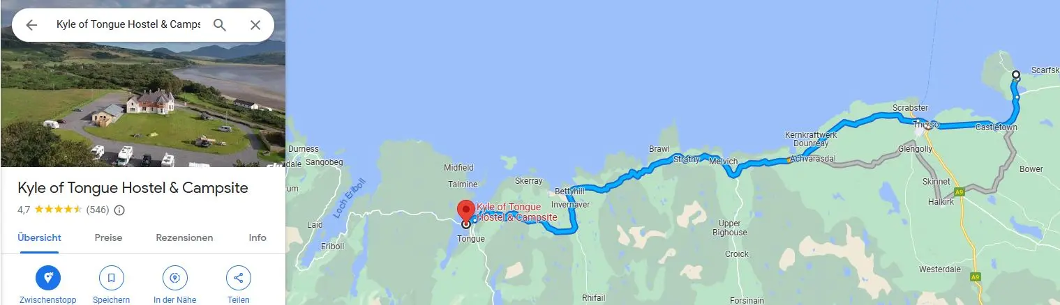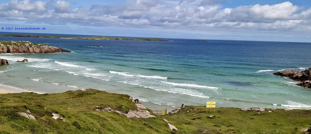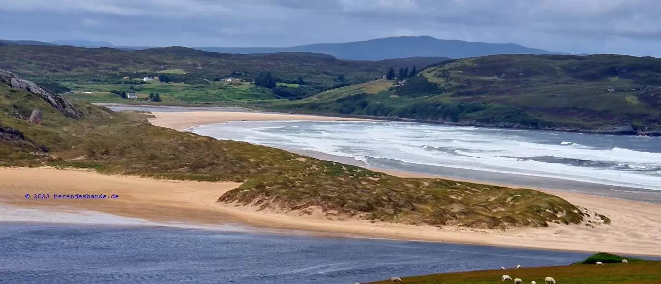 Am nächsten Morgen ist die Sonne hinter dicken Wolken versteckt, dafür pfeift ein kräftiger Wind. Wir fahren zurück auf die NC500 zur Westküste. Hier gibt es Dünen und teilweise Sandstrände. Die Straße verläuft oft an der Küste und ist manchmal nur eine einspurige Buckelpiste. Wir treffen unterwegs freilaufende Schafe. In Tongue haben wir Pech und kollidieren mit einem entgegenkommenden Wohnmobil. Die Außenspiegel beider Fahrzeuge treffen aufeinander. Wir halten sofort an, aber unser Unfallgegner fährt weiter ohne zu Stoppen. Der rechte Außenspiegel ist komplett zerbrochen und an der Beifahrertür gibt es tiefe Kratzer. Das zerbrochene Spiegelglas lässt sich zum Glück wieder befestigen und so kann man den Außenspiegel wenigstens halbwegs benutzen. Die zerbrochene Halterung wird mit Panzertape zusammen gehalten. Die nächste Ford Werkstatt ist etwa100 km entfernt. Wir wissen weder den Typ noch das Kennzeichen des beteiligten Fahrzeugs, also sparen wir uns auch den Anruf bei der Polizei. Stattdessen bleiben wir in Tongue am Hostel, keine 150 m entfernt von der Unfallstelle. Der Platz ist relativ neu, allerdings lieblos auf schwarzem Schotter angelegt. Alle Services sind vorhanden, es gibt auch Zeltwiesen. Für 33 Pfund inklusive Strom ist es okay. Gassirunden mit den Hunden sind extrem schwierig. Entlang der A838 ist es ziemlich gefährlich, da die Autos relativ schnell fahren und keine Gehwege vorhanden sind. An Abend ist der Platz gut gefüllt.