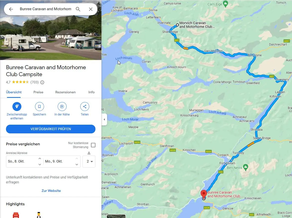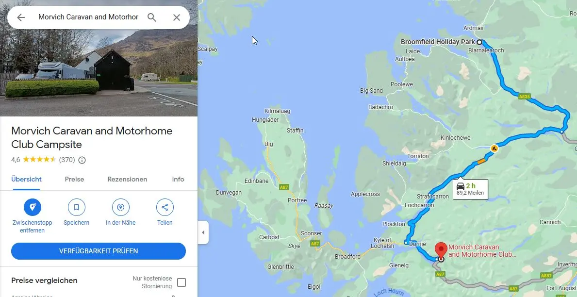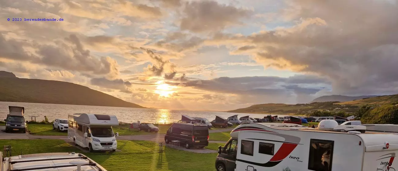 Der Freitag begann, wie der Donnerstag, mit Regen und einer guten Brise von der Bucht her. Es geht heute weiter die NC500 - das Etappenziel ist weit gesteckt. Wir wollen bis zur Isle of Skye. Auch diese Etappe hält wieder jede Menge Eindrücke für uns bereit. Das Panorama ist umwerfend. Es wird ein Sommertag, die Sonne kommt zum Vorschein und die Temperatur steigt auf sommerliche 17 Grad. Ein paar Beispielbilder haben es in die Diashow geschafft, nur ein Bruchteil dessen, was wir gesehen haben. Wir beginnen mit der Platzsuche für die Nacht und stellen fest, dass es in der Nähe der Isle of Skye kaum Campingplätze gibt. Die, die wir anfahren oder per Email oder Telefon kontaktieren, sind voll. Okay, es ist Wochenende in der Hauptsaison, also haben wir bisher nur Glück gehabt? Wir orientieren uns etwas mehr landeinwärts, dieser Trick hatte in Schweden immer funktioniert. Und es klappt auch jetzt in Schottland. Wir bleiben bei Camping Morvich, etwa 30 km entfernt der Isle of Skye. Es handelt sich um einen Camping Club, Mitglieder bekommen Rabatt. Die Camping Key Card International weist uns als Mitglieder aus. Für 34 Pfund sind wir willkommen. Der Platz ist kaum frequentiert, hat 88 Stellplätze und eine große Zeltwiese. Das Sanitär ist schon älter, aber gut in Schuss und sauber. Der Platz ist bei Wanderern beliebt und so sind auch Gassirunden kein Problem. Bei sonnigem Wetter checken wir für drei Tage ein.
