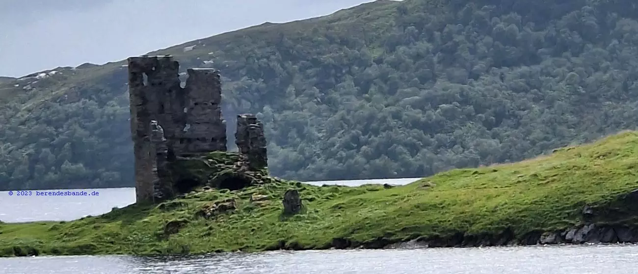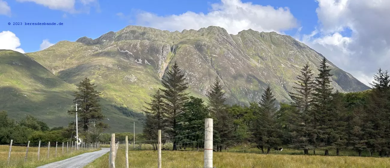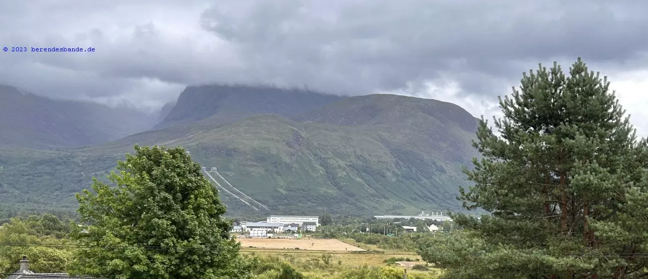 Der Montag beginnt trüb, so fällt uns der Abschied nicht schwer. Wir fahren nach Fort William. Auf der Tour machen wir einen Stopp am Commando Memorial, einer Gedenkstätte für die im zweiten Weltkrieg gefallenen Soldaten. Von dort hat man einen guten Ausblick auf den höchsten Berg Schottlands, den Ben Nevis mit 1348m. Leider liegt der Gipfel in den Wolken. In Fort William bekommen wir keinen Stellplatz. Die wenigen Campingplätze sind voll und ohne Buchung ist nichts zu machen. Wir fahren etwa 15 km weiter nach Onich. Hier gibt es einen Campingplatz des Caravaning and Motorhome Club, genau wie in Morvich. Hier gibt es noch Plätze. Der Platz hat einen Kiesstrand zum Firth of Lorn. Leider gibt es nur wenig Sonne und nur 14 Grad, so dass an Strandurlaub nicht zu denken ist. Mit der Camping Key Card international ist man auch hier als Mitglied willkommen. Die Nacht kostet uns 41 Pfund, Fort William und die Hochsaison lassen grüßen. Der Platz ist sehr ähnlich dem in Morvich, große Parzellen, ein in die Jahre gekommenes Sanitär, was aber super sauber ist. Es gibt 99 Parzellen, jedoch keine Zeltwiese. Gegen Abend ist der Platz voll. Gassirunden sind kein Problem, wenn man den Platz am Eingang verlässt und die folgende Hauptverkehrstrasse überquert.