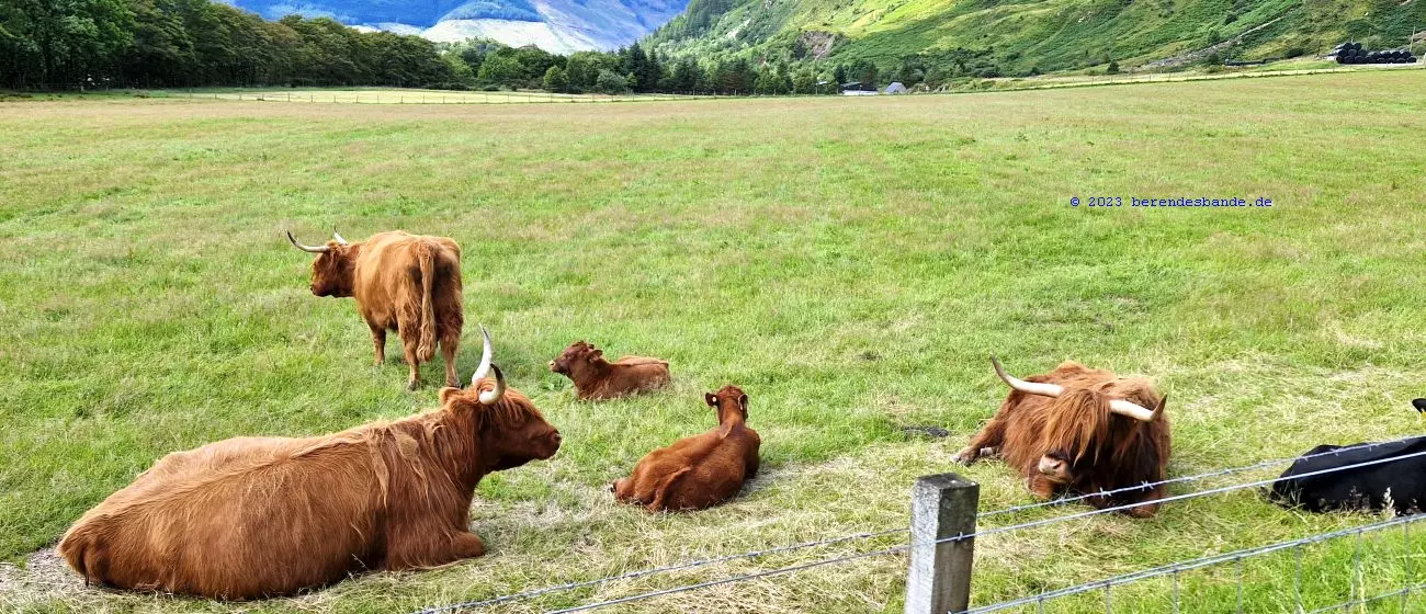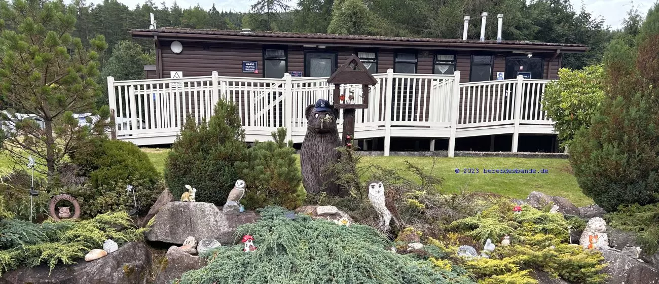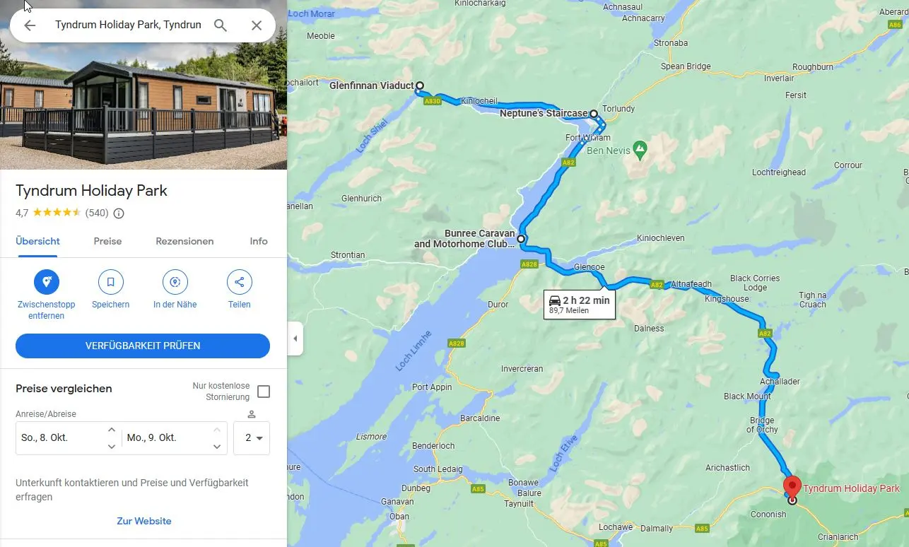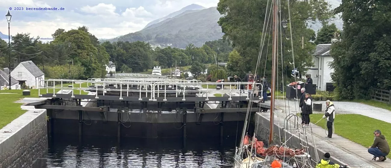 Am Dienstagmorgen muss leider etwas Bürokram erledigt werden. Da die Emma nach unserem Urlaub schon für die nächste Tour verplant ist, muss die Reparatur organisiert werden. Wir brauchen einen neuen rechten Außenspiegel, die Beifahrertür braucht etwas Maniküre oder Lack und am Aufbau ist hinter der Fahrertür die Dekorfolie beschädigt. Es geht darum, möglichst bald einen Termin in einer oder mehreren Werkstätten zu bekommen. Wir werden sicherlich unsere Emma nicht zum Händler an den Bodensee zur Reparatur bringen. Also erst mal telefonieren. Macht die Challenger Werkstatt auch die Reparatur am Basisfahrzeug oder brauchen wir dafür eine Ford Werkstatt? Ist die Dekorfolie leicht zu bekommen oder gibt es lange Wartezeiten? Diese Fragen müssen geklärt werden. Also werden einige Vertragshändler angerufen und anschließend Fotos per Email versandt. Nun heißt es warten auf einen Kostenvoranschlag. Auf unserem Tagesplan steht der Besuch des Glenfinnan Viaduct, der Brücke aus den Harry Potter Filmen. Die Anreise ist etwa 30 km lang. Das Viaduct ist nur zu Fuß zu erreichen und kann von der Straße aus nicht eingesehen werden. Leider haben sehr viele Harry Potter Fans die gleiche Idee. Trotz mehrfacher Versuche finden wir keinen Parkplatz. Der offizielle Parkplatz ist hoffnungslos überfüllt. Schweren Herzens fahren wir zurück Richtung Fort William. Kurz vor der Stadt befindet sich Neptune's Staircase, eine Schleusenanlage mit acht Stufen. Hier sind Parkplätze kein Problem. So werfen wir einen Blick auf die Schleusenanlage und legen eine Gassirunde für unsere Vierbeiner ein. Dann brechen wir Richtung Glasgow auf. Auf einer schmalen Brücke wird unser Außenspiegelrest von einem Wohnwagen touchiert. Der Spiegel gibt nach und verliert noch ein paar Splitter. Auch dieser englische Zeitgenosse setzt seine Fahrt unvermindert fort. Gut dass wir noch keinen neuen Spiegel besorgt haben. Es ist schon spät, daher stoppen wir für eine Nacht bei Tyndrum Holiday Park, direkt an der A82. Es ist ein kleiner Campingplatz, der neben etwa 60 Stellplätzen, fassähnliche Mietunterkünfte in verschiedenen Größen anbietet. Der Platz ist mit Liebe zum Detail angelegt. Das Sanitärhaus ist modern und sauber. Der Platz ist sehr hundefreundlich und mit 30 Pfund, nicht teuer. Gassirunden sind kein Problem.