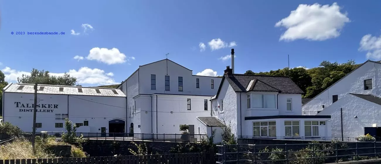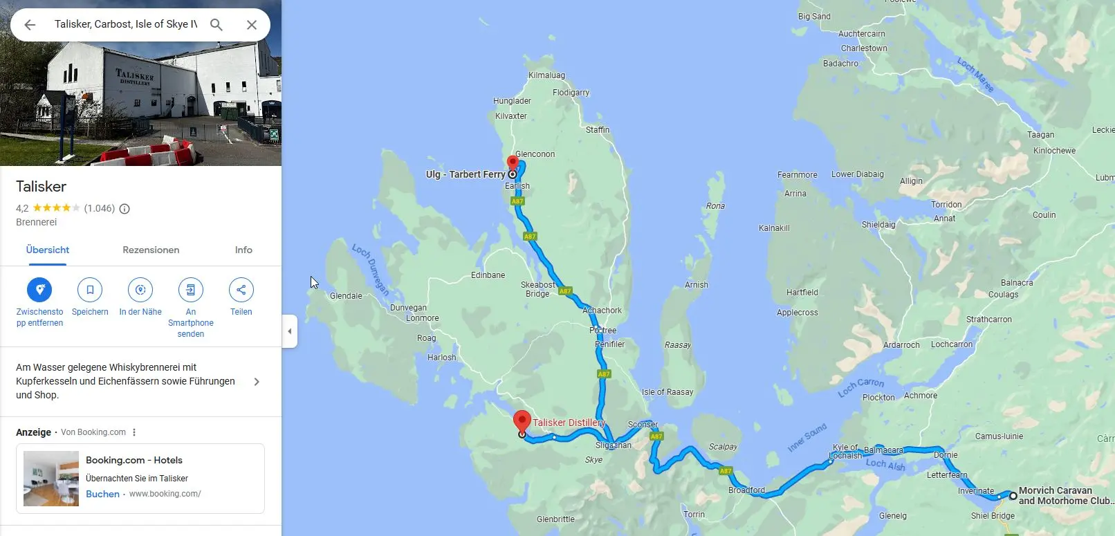 Wie geplant, starten wir von Morvich zu unserer Erkundung der Isle of Skye. Die Insel ist über die Skye Bridge mit dem "Festland" verbunden. Wir beginnen mit einem Besuch der Talisker Destillerie. Wir haben einige Flaschen von hier in unserer Hausbar. Der Shop ist sehr schön und modern. Es gibt nicht nur Whisky, sondern auch allerlei mehr oder weniger Nützliches. Neben dem obligatorischen Kühlschrankmagneten gibt es noch eine Fleecejacke für mich. Der Whisky ist in Deutschland übrigens etwa ein Drittel billiger. Also studieren wir das Sortiment und merken uns die Sorten, die wir dann online bestellen werden. Dann geht es weiter bis in den Norden der Insel in den Hafen von Uig. Auf dem Weg dorthin bekommen wir wieder umwerfende Aussichten zu sehen. Die Berge in Verbindung mit den Fjorden und dem Meer, einfach toll. Wir hatten gedacht, wir bekommen im Hafen Fish & Chips, doch das war ein Trugschluss. Es gibt noch nicht einmal einen Parkplatz für Emma, geschweige denn Fisch. Also fahren wir langsam zurück, gehen noch eine schöne Gassirunde mit unseren Fellnasen. Kurz vor der Skye Bridge gibt es dann doch noch ein Fish & Chips Take Away. So wird noch der Hunger gestillt, bevor wir auf den Platz nach Morvich zurück kehren. Es war ein toller und sonniger Tag. Morgen geht es weiter Richtung Süden.