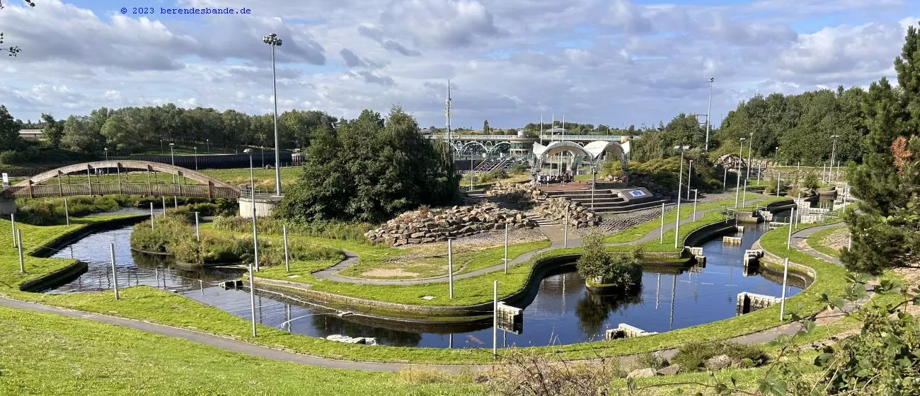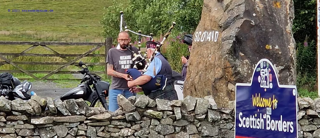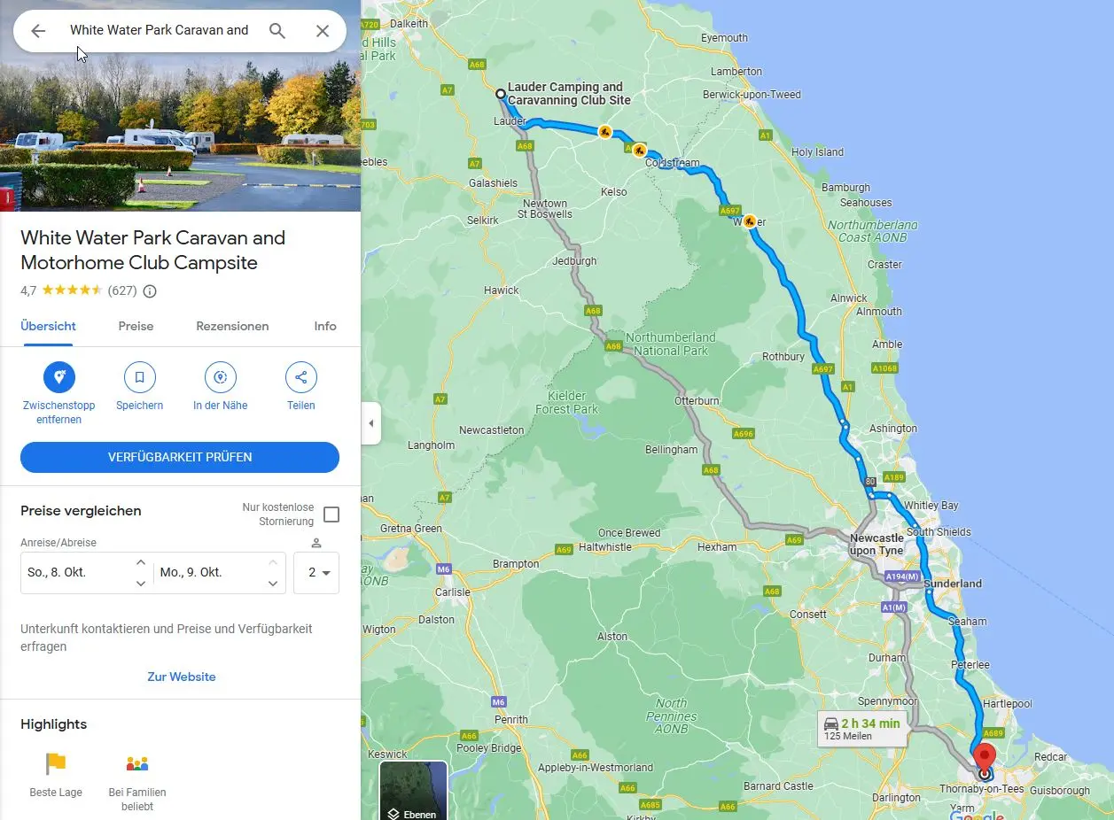 Der Freitagmorgen startet ruhig und ohne neue Überraschungen. Snickers geht es viel besser und bisher nagt er nicht an seiner dick bandagierten Pfote. Wir sind nun unwiderruflich auf dem Heimweg. Unsere Tour geht heute auf direktem Weg nach Newcastle, etwa 200 km. Wir stoppen kurz an der Grenze, um das letzte Bild von Schottland zu schießen und beginnen dann mit der Durchquerung von England. Am Nachmittag checken wir bei White Water Park Caravan and Motorhome in Stockton-on-Tees ein. Es ist wieder ein Platz vom Caravan and Motorhome Club. Bisher sind wir immer gut gelandet. Auch diesmal ist alles bestens. Im nahegelegenen Supermarkt mit Apotheke kaufen wir Verbandsmaterial für Snickers Pfote. Der Verband muss morgen gewechselt werden. Auf direktem Weg nach Dover sind es noch etwa 520 km. Die Fähre ist für Dienstag gebucht, also planen wir noch einen Schlenker über Kingston und werden die Küstenstraße nehmen.