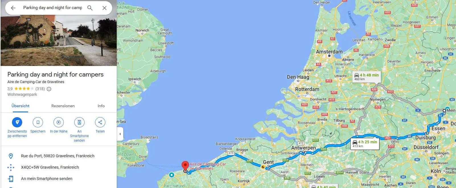 Es ist Montagnachmittag als wir endlich rollen. Erst muss noch etwas Knabberzeug für die Hunde eingekauft werden, das Paket vom Onlinehändler ist leider nicht rechtzeitig eingetroffen. Das erste Etappenziel ist irgendwo zwischen Antwerpen und Calais. Als wir dann die französische Grenze passieren, zeigt sich, dass etwas mehr Detailplanung hilfreich gewesen wäre. In der Nähe von Calais gibt es wenige Camping- oder Stellplätze. Die Campingplätze sind voll und so schwindet mit dem Tageslicht auch die Hoffnung auf einen Stellplatz für die Nacht. Bis Anja dann, mehr als letzten Versuch einen Stellplatz zu finden, einen Parkplatz für Wohnmobile in Gravelines entdeckte. Dort waren noch Plätze frei. Für 24 Stunden Parkzeit zahlen wir 7,50 € . Es gibt nichts, außer einem ebenen Wiesenstellplatz. Die schöne Aussicht auf die Marina ist kostenlos.