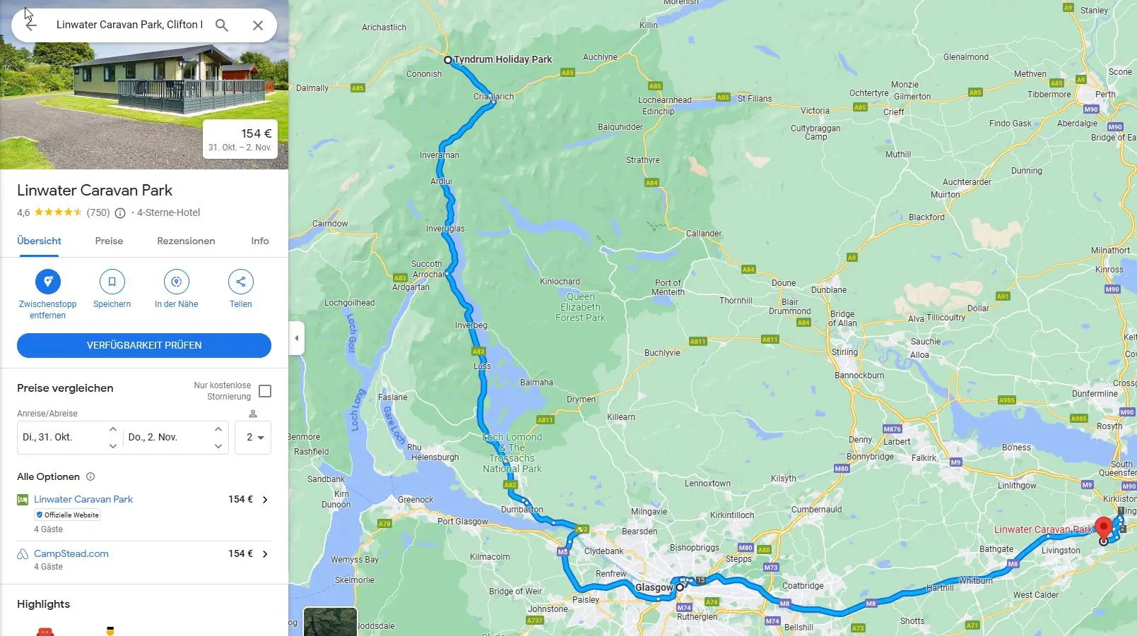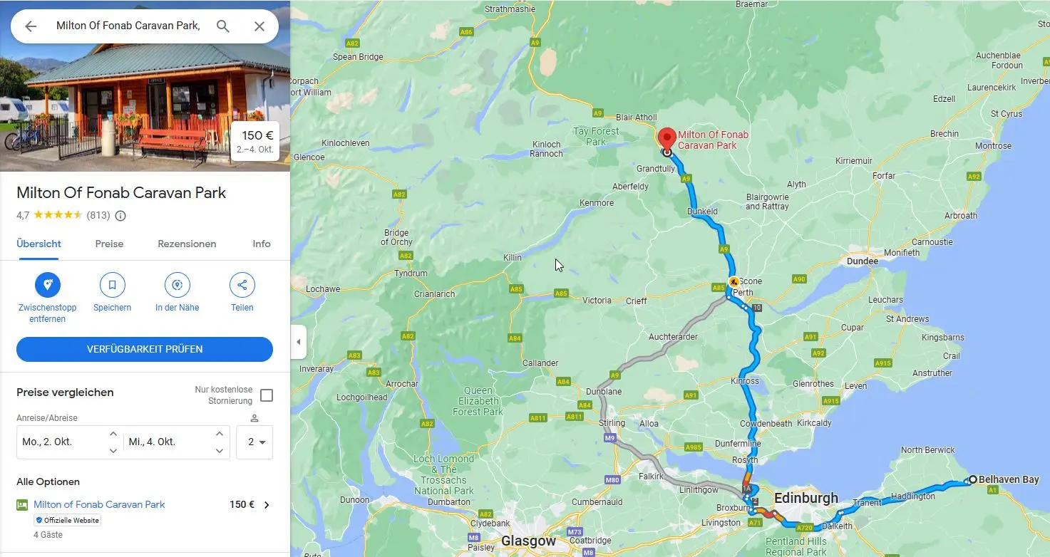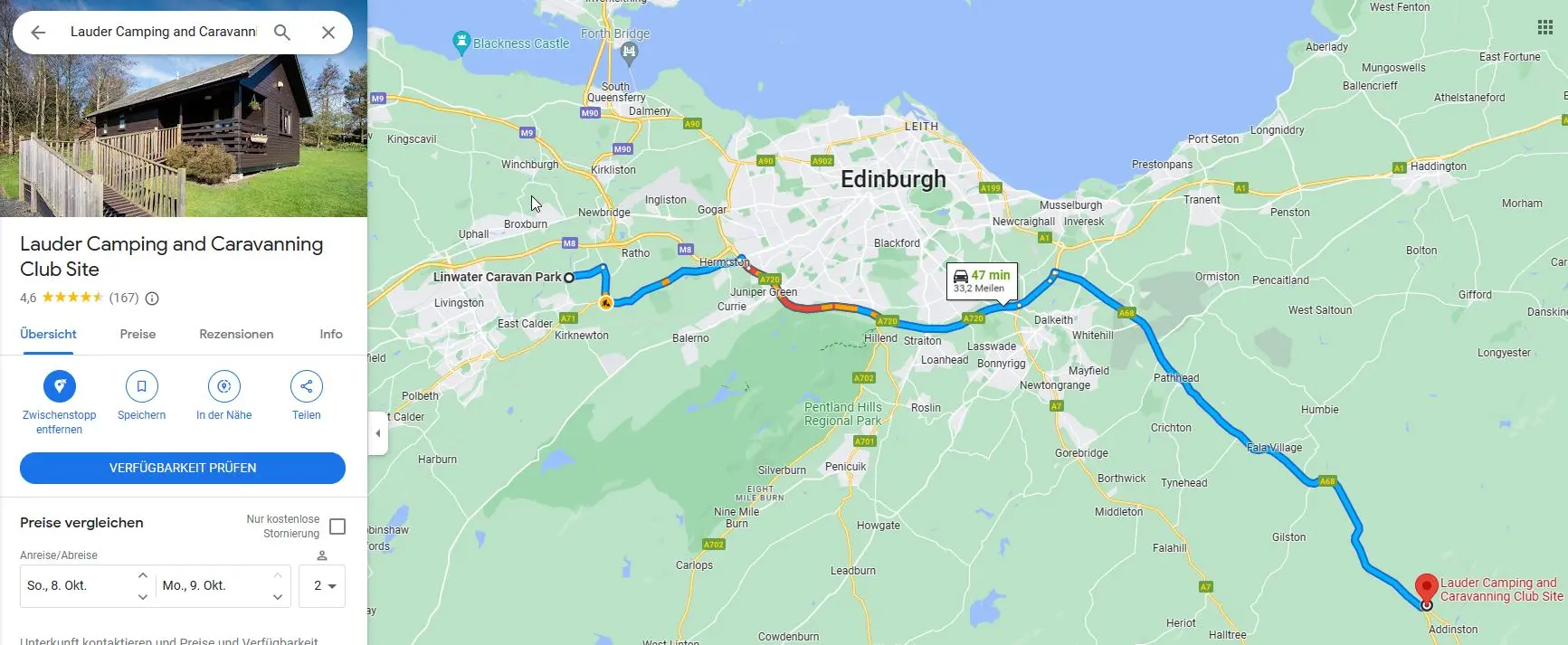 Unsere Fahrt geht weiter nach Glasgow. Wir wollen das Hard Rock Cafe besuchen. Wir fahren die A82 Richtung Glasgow und kommen am Loch Lomond vorbei. Es ist der flächenmäßig größte See in Schottland. Die A82 entlang des Ufers ist nichts für schwache Nerven. Die Breite der Fahrbahn schwankt und es gibt Schlaglöcher, in die problemlos eine oder zwei Wassermelone passen würde. Teilweise ist es so eng, dass maximal zwei PKW einander passieren können. Hier ist allerdings reger Betrieb mit großen Reisebussen und auch große LKW nehmen diese Tour. Die Geschwindigkeit ist auf 50 mph beschränkt, was 80 km/h entspricht. Angemessen wären maximal 50 km/h etwa 30 mph. Wir müssen mehrfach scharf bremsen und stehen bleiben, um nicht mit anderen Fahrzeugen zu kollidieren. Erst als wir die gegenüberliegende Seite des Sees erreichen, wird die Straße breiter und der Angstschweiß steht uns nicht mehr auf der Stirn. Wir erreichen Glasgow. Die Stadt wirkt auf uns herunter gekommen. Es ist laut, voll und dreckig. Wir versuchen das Hard Rock Cafe zu erreichen. Es liegt in der Fußgängerzone. Für unsere Emma gibt es keinen legalen Parkplatz und überall tummeln sich Polizisten oder Politessen. Wir versuchen etwas außerhalb einen Parkplatz zu finden, leider ohne Erfolg. So haben wir wieder kein Glück und fahren weiter. Wir fahren nach Edinburgh und bleiben eine Nacht bei Linwater Caravan Park. Der Platz liegt in der Nähe des Flughafens. Wir bekommen nur noch einen Stellplatz auf der Fläche für Spätankommende, außerhalb des Platzes. Der Preis ist 36 Pfund. Das Sanitär ist ganz okay und sauber. Wir werden morgen einen weiteren Versuch unternehmen, das Hard Rock Cafe zu besuchen. Hoffentlich klappt es diesmal.