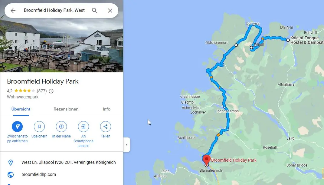 Der Donnerstagmorgen beginnt trüb und kalt. Das Thermometer zeigt 10 Grad. Nach der Morgenroutine geht es wieder auf die Piste. Wir fahren weiter über die A838 Richtung Durness, dann weiter bis Scourie und schließlich nach Ullapool. Die Etappe ist 156 km lang und wird die schönste Etappe, die wir bisher gefahren sind. Wir hätten eine Kamera an der Frontscheibe montieren sollen und hätten drei Stunden Videomaterial für die Schönheit Schottlands aufzeichnen können. Leider haben wir das nicht getan und so müssen ein paar Fotos für die Eindrücke, die wir heute gewonnen haben, reichen. Zu unserer Freude, schaut auch noch die Sonne heraus. Das macht die Eindrücke noch schöner. Die Tour geht durch die Berge, entlang der Küste, entlang der Fjorde, über schmale Straßen, etwa die Hälfte der Strecke führt über Single-Track-Roads. Hinter jeder Kurve wartet eine neue Überraschung. Die Tour endet in Ullapool bei Broomfield Holiday Park. Der Platz liegt direkt am Hafen. Er hat 140 große Parzellen, dazu noch mehrere Zeltwiesen. Es gibt zwei Waschhäuser, die relativ modern sind. Die Nacht kostet 32 Pfund inklusive Strom. Man kann keine Parzellen buchen, man muss bis 19 Uhr da sein, sonst steht man vor verschlossener Schranke. Der Platz füllte sich gegen Abend, wird allerdings nicht ganz voll. Es gibt die Möglichkeit mit den Hunden zu gehen. Es gibt einen kleinen Rundweg über den Strand ins Dorf und zurück zum Campingplatz. Der Tag endet freundlich, auch wenn das Thermometer nicht über 13 Grad steigen will.