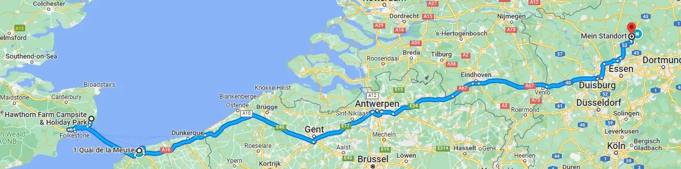 Wir starten relaxed in den Dienstagmorgen. Unsere Fähre geht um 19:05 Uhr. Wir versuchen, unser Flexticket für eine frühere Passage einzusetzen. Zum Hafen ist es nicht weit und es gelingt uns, die Fähre um 13:45 h ohne Aufpreis zu bekommen. Nach der Ankunft in Calais fällt es nicht schwer, sich wieder an den Rechtsverkehr zu gewöhnen. Wir starten Richtung Heimat und kommen gut voran. Die Tour geht über Gent, Antwerpen Richtung Eindhoven. Kurz vor Einhoven legen wir eine größer Pause ein. Es sind noch 177 km bis nach Hause und wir beschließen, diese Strecke noch zu fahren. Kurz nach 22 Uhr erreichen wir unser Zuhause.